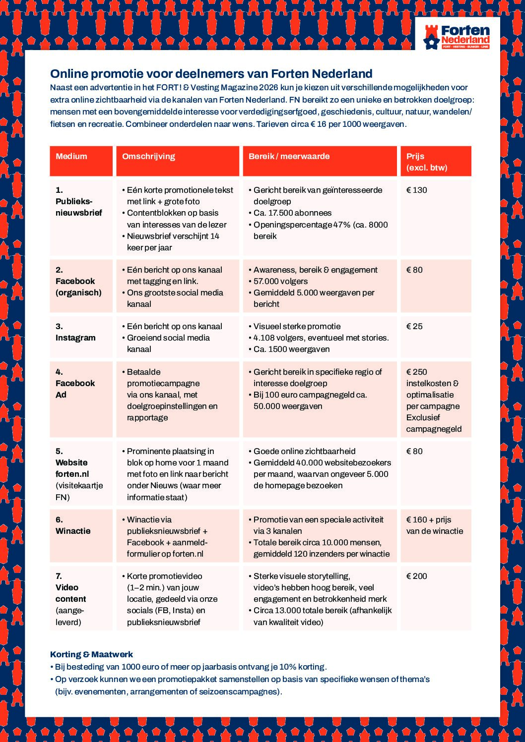 Forten Nederland heeft een nieuw Deelnemers Pluspakket ontwikkeld, waarbij je tegen lage tarieven via onze kanalen extra online zichtbaarheid kunt inkopen. Forten Nederland bereikt een unieke en betrokken doelgroep: mensen met een bovengemiddelde interesse voor verdedigingserfgoed, geschiedenis, cultuur, natuur, wandelen/fietsen en recreatie. Combineer onderdelen naar wens, zoals een blok op onze homepage, Facebook Ad of videocontent. Tarief: circa € 16,00 per 1000 weergaven. Download het promotiepakket.