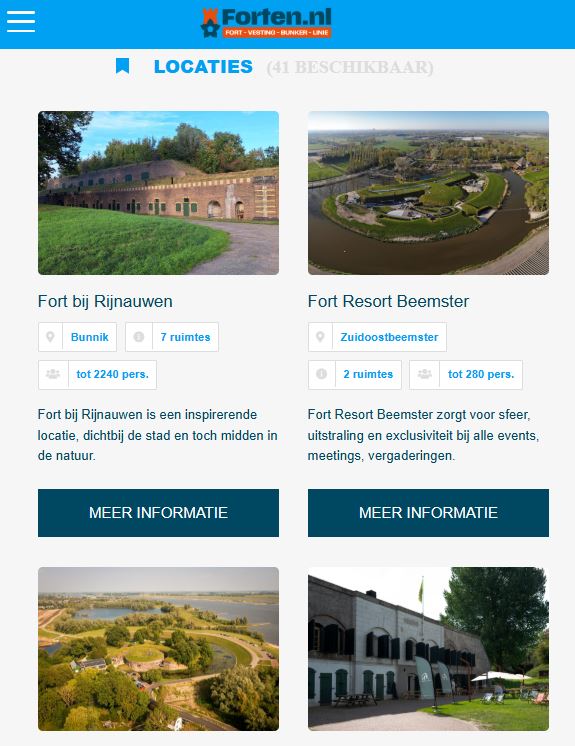 Eeuwenoude forten en vestingen zijn populaire locaties om een zakelijke vergadering te houden of een familiereünie te organiseren. Daarom ontwikkelde Forten Nederland voor deelnemers een aparte site waar dit aanbod bij elkaar komt en geïnteresseerden kunnen zoeken via o.a. een filter op regio, aantal personen en type ruimte. Check ook verhuur.forten.nl! Staat jouw locatie daar goed op, zodat iedereen die een fort-locatie wil huren, in één oogopslag ziet wat jij te bieden hebt? Bij vragen of gebrek aan tijd mail je bram@fortennederland.nl.