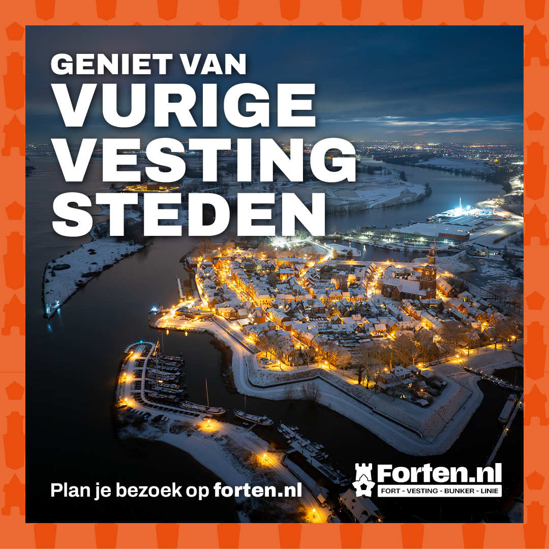 Nederland telt 159 vestingsteden. Hiervan zijn 74 vestingen aangesloten bij Forten Nederland. Vestingsteden zijn stoere bakens in het landschap vanwege hun rijke geschiedenis (muren, grachten, kanonnen), unieke stervormige architectuur, goed bewaard gebleven charme, strategische ligging met mooie uitzichten en een divers aanbod van cultuur, musea en gezellige binnensteden. Ze bieden een fascinerende reis door de tijd en zijn populair voor dagjes uit of weekendtrips. Forten Nederland draagt graag haar steentje bij aan de promotie van deze gave erfgoedlocaties via vestingen.nl, het jaarlijkse event Nationaal Weekend van het Verdedigingserfgoed en al onze andere kanalen. Sinds twee weken loopt er een online campagne voor Vurige Vestingsteden in de winter. Deze heeft inmiddels 57.849 mensen bereikt, maar dat aantal zal snel oplopen. Is jouw vestingstad/gemeente nog geen deelnemer? Sluit je dan snel aan bij onze forten-, vesting-, en bunkerfamilie op fortennederland.nl en bekijk wat wij voor jouw vesting kunnen betekenen.