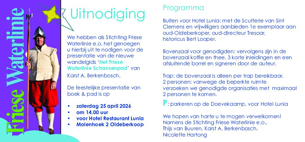 Stichting Friese Waterlinie heeft een nieuwe wandelgids ‘Het Friese Waterlinie Schansenpad’ ontwikkeld in samenwerking met Uitgeverij Gegarandeerd Onregelmatig. Deze nieuwe wandelroute volgt de militaire geschiedenis van 1672 en 1673 in Zuidoost-Friesland. In het Rampjaar werd dit gebied geteisterd door de troepen van de bisschop van Münster, Bernhard von Galen, alias Bommen Berend. Het 231 kilometer lange Schansenpad gaat langs de schansen en versterkingen van de Friese Waterlinie. Zo treedt de wandelaar in het spoor van de soldaten, die Friesland verdedigden en aanvielen. De feestelijke presentatie van boek & pad vindt plaats op zaterdag 25 april 2026 om 14.00 uur voor Hotel Restaurant Lunia in Oldeberkoop. Meer informatie.